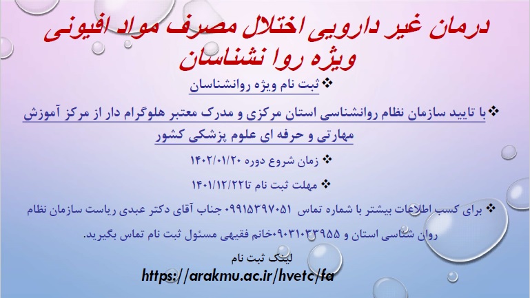 برگزاری دوره آموزشی و مهارتی اختلال مصرف مواد افیونی ویژه روان شناسان ۱۵ اسفند ۱۴۰۱ | ۰۸:۴۰ کد : ۳۲۸۶۷ اطلاعیه ارسال به دیگران نام شما ایمیل شما ایمیل دریافتکننده ارسال انصراف تعداد بازدید:۲۰۱۰۱ لینک ثبت نام